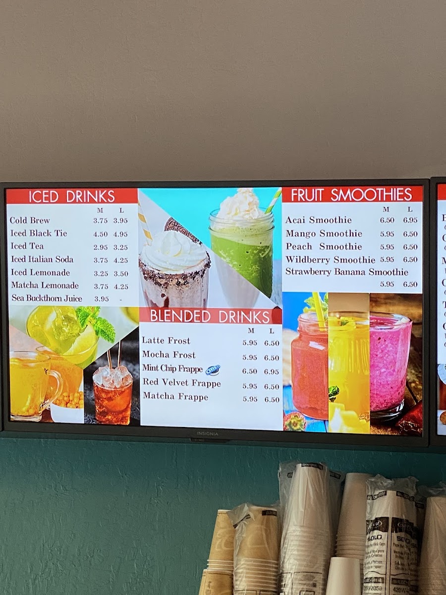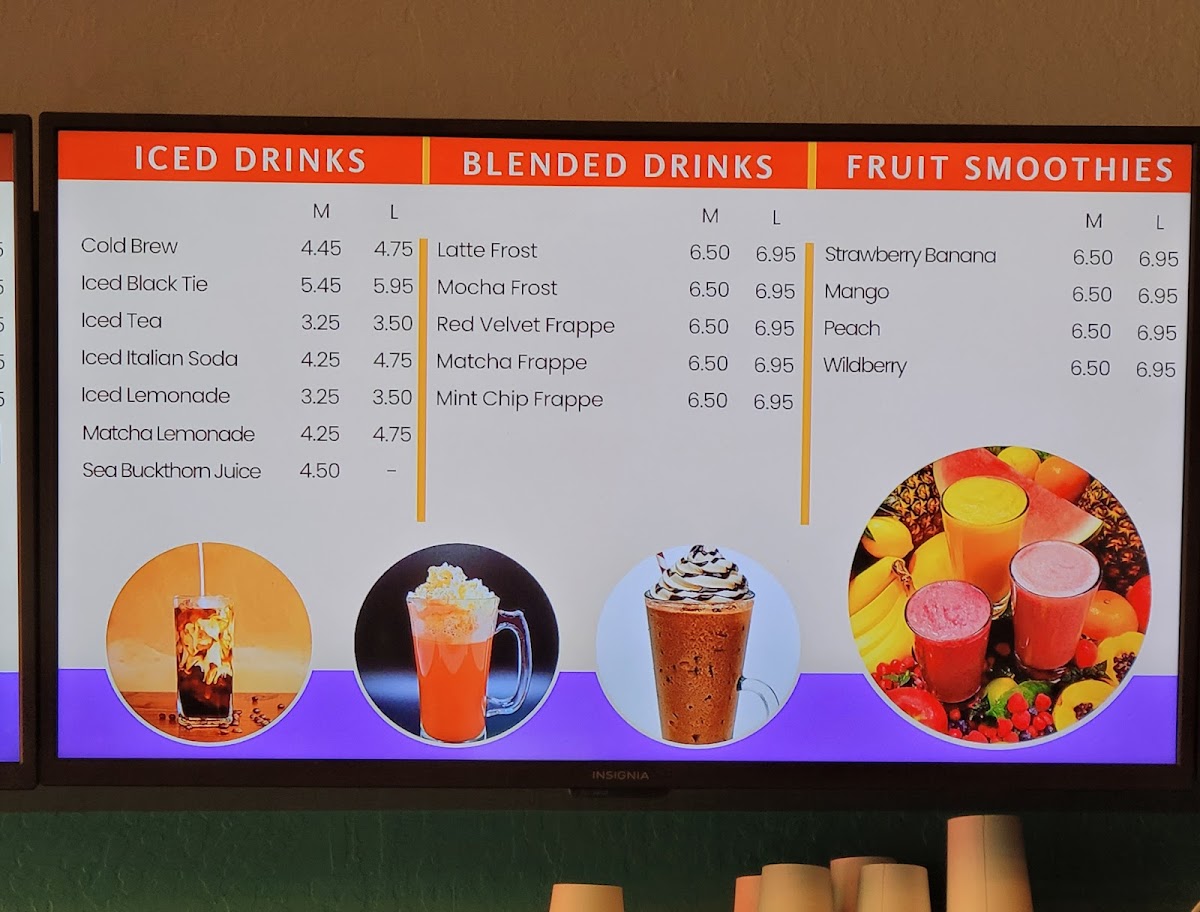 Beverages feature a wide range of options including coffee, tea, and specialty drinks. Customers can choose from traditional coffee varieties such as iced coffee and cold brews, as well as tea options like Thai Tea, Taro Milk Tea, and Bubble Tea. Unique drinks such as Sea Buckthorn Juice, Golden Milk Latte, and Matcha Lemonade are also available.
