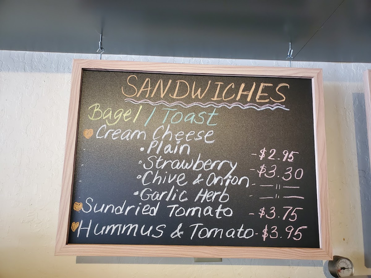 Sandwiches include several bagel and toast choices with different spreads and toppings, such as smoked salmon with cream cheese, egg and sausage, hummus and tomato, and garlic cream cheese on wheat or white bread. These items are suitable for a light meal or snack.